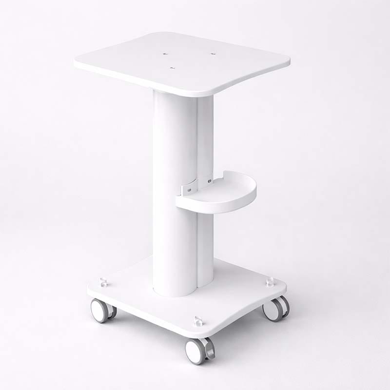 The trolley is built with a reinforced metal frame and a solid square tabletop, capable of supporting equipment up to 200 kg, making it ideal for shockwave machines, electrotherapy units, aesthetic devices, and diagnostic equipment. Its central column design ensures excellent balance while maintaining a minimal footprint.